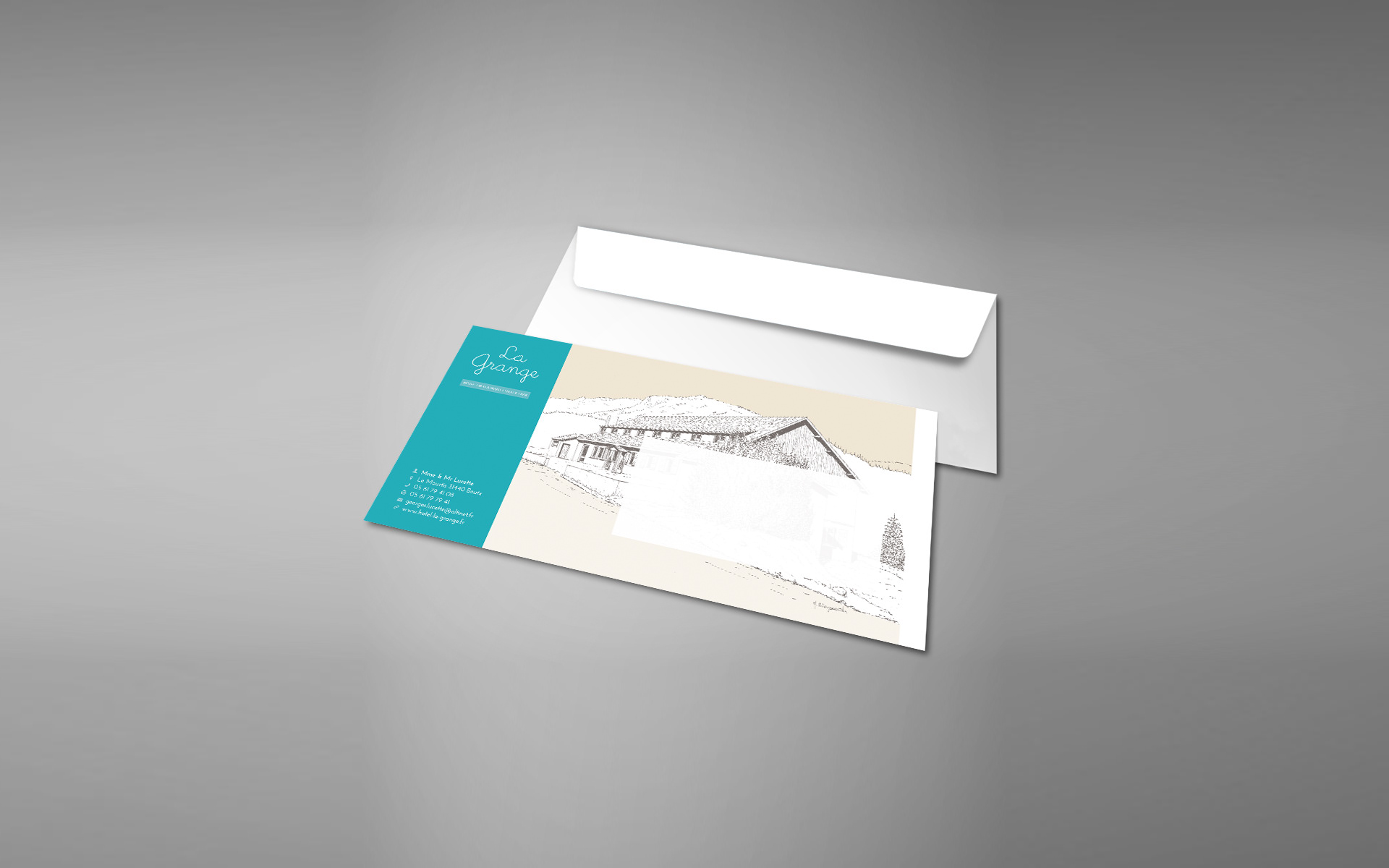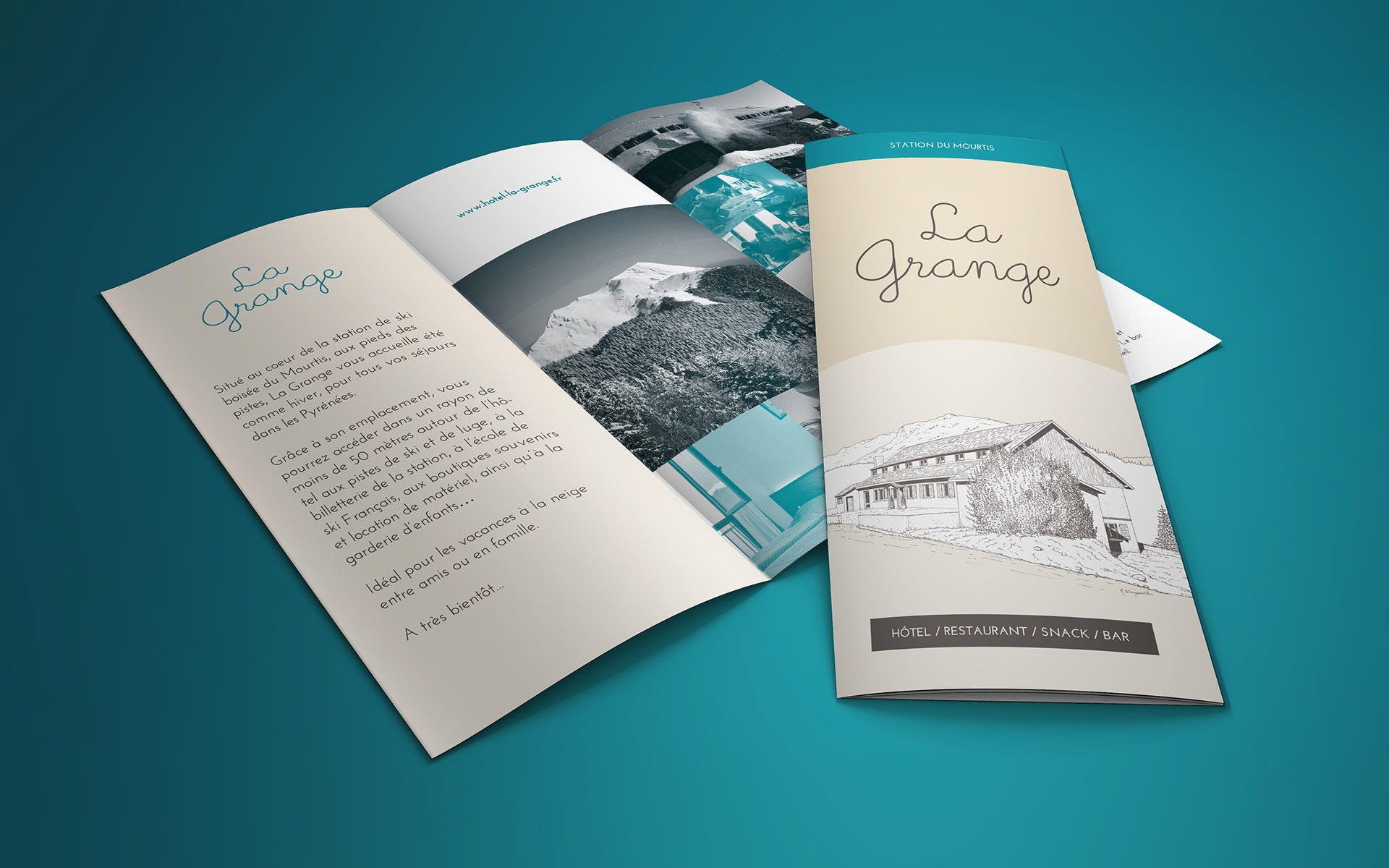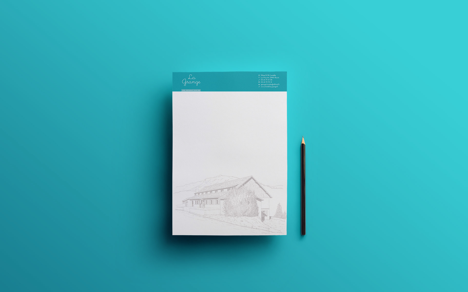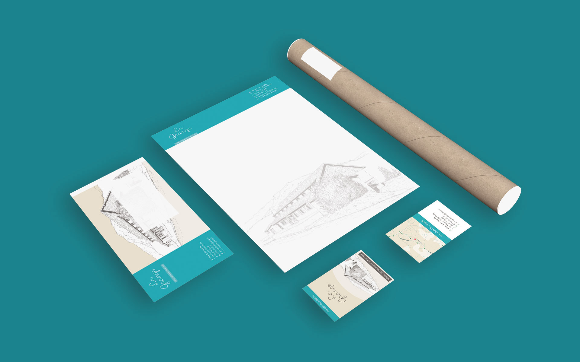 Création de la communication papier de l'hôtel La Grange (carte, menu, dépliant, carte de visite, papier à en-tête, enveloppe, ...).