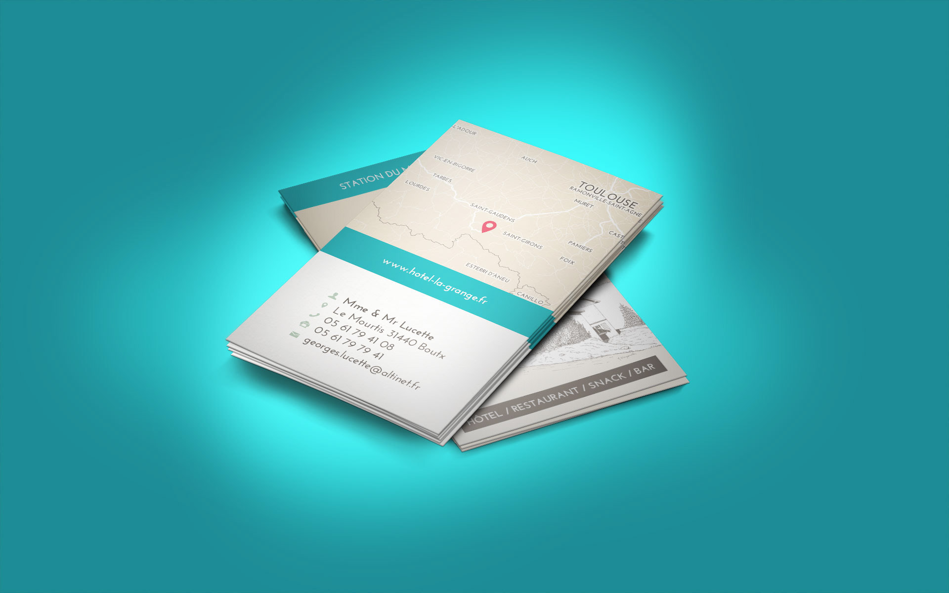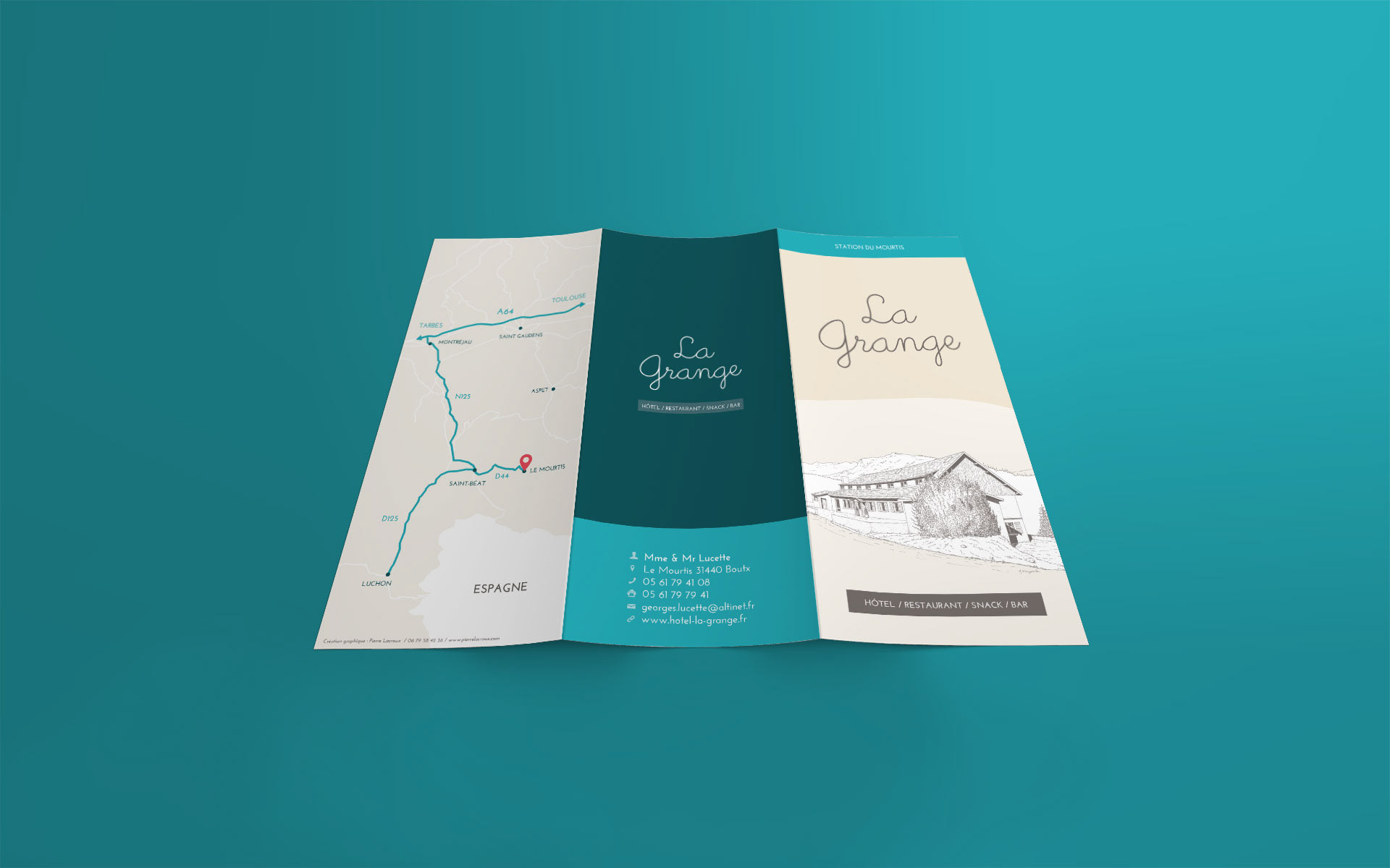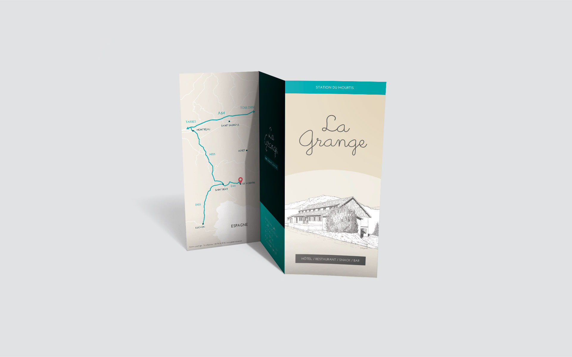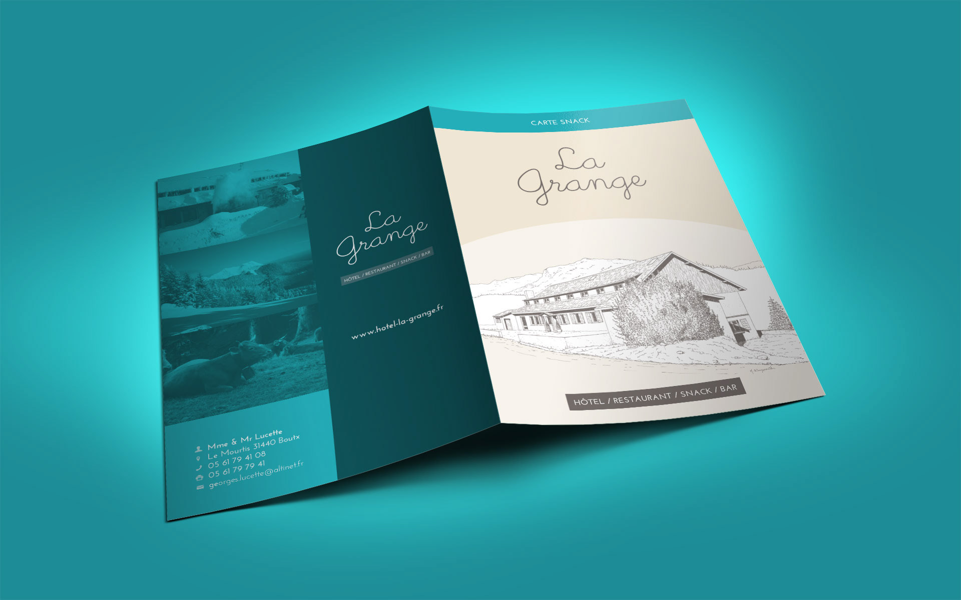 Création de la communication papier de l'hôtel La Grange (carte, menu, dépliant, carte de visite, papier à en-tête, enveloppe, ...).