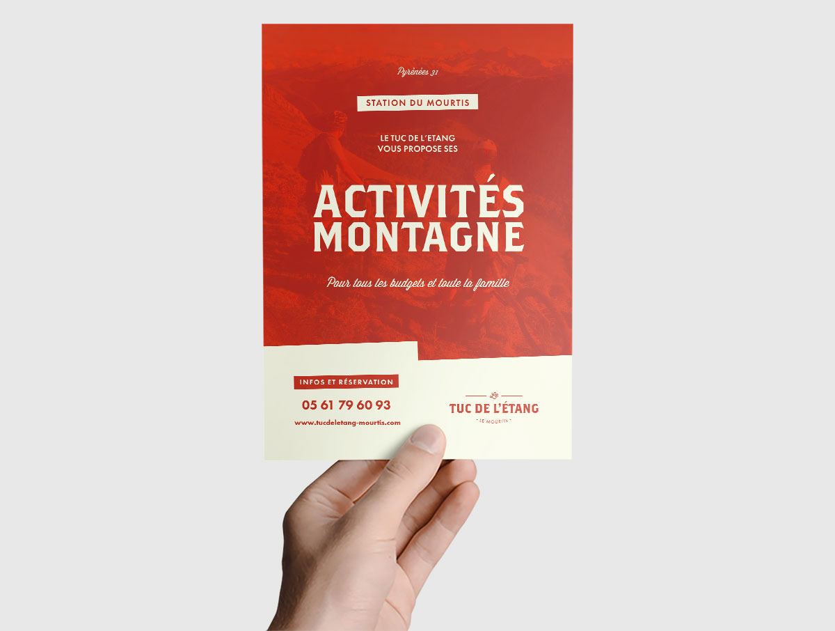 Création de l'identité graphique, de la communication papier et de la signalétique du restaurant Le Tuc de l'Etang (station de ski du Mourtis dans les Pyrénées centrales).