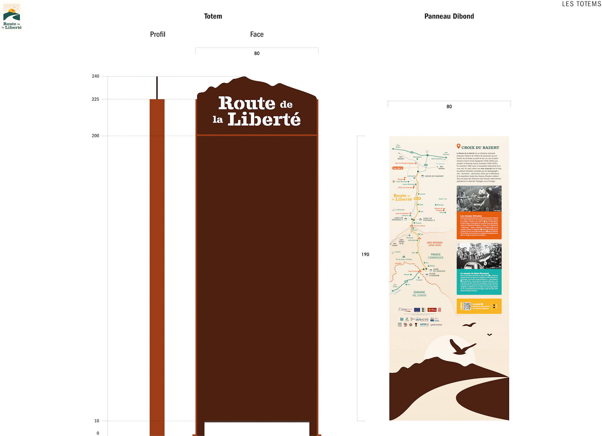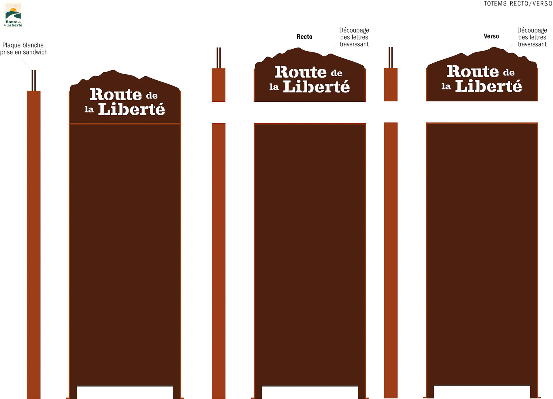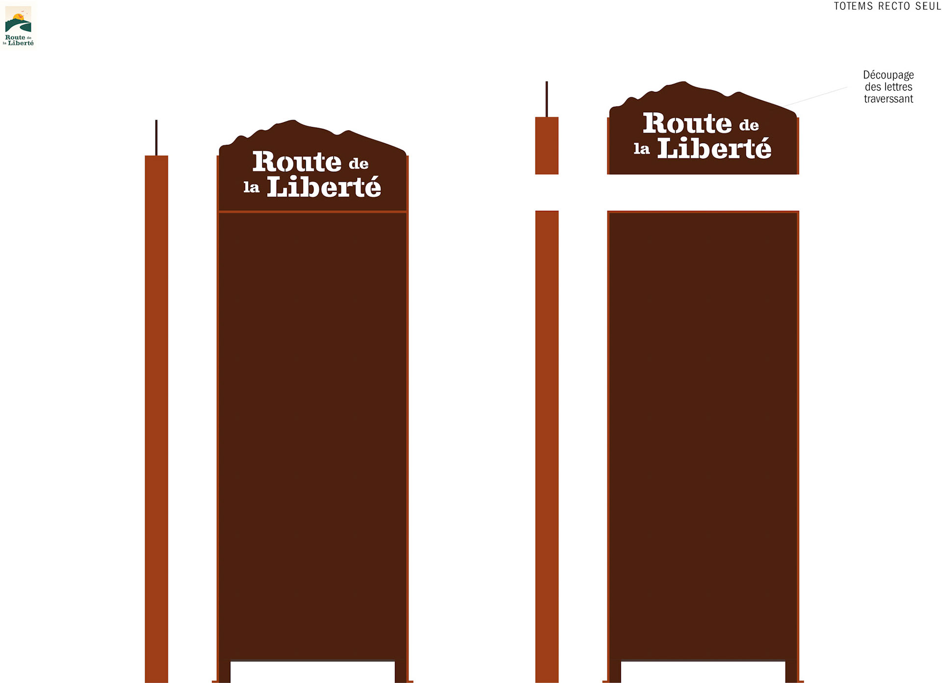 Création de l'identité graphique de la route de la liberté et 5 totems.